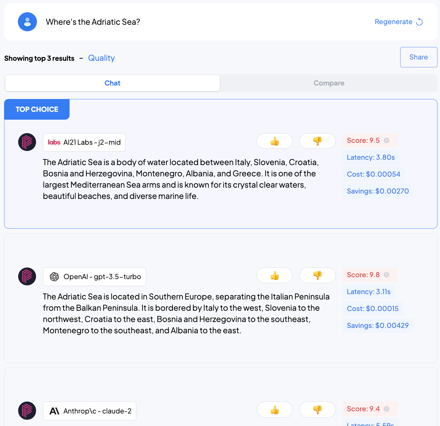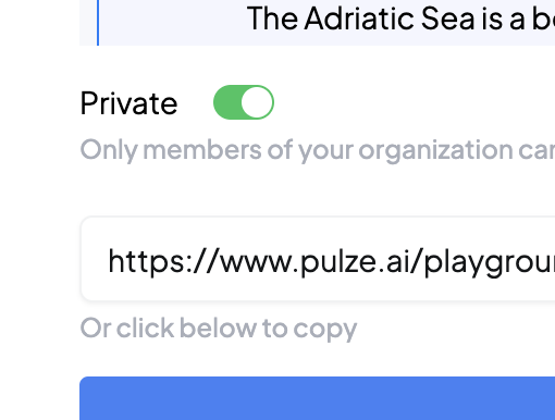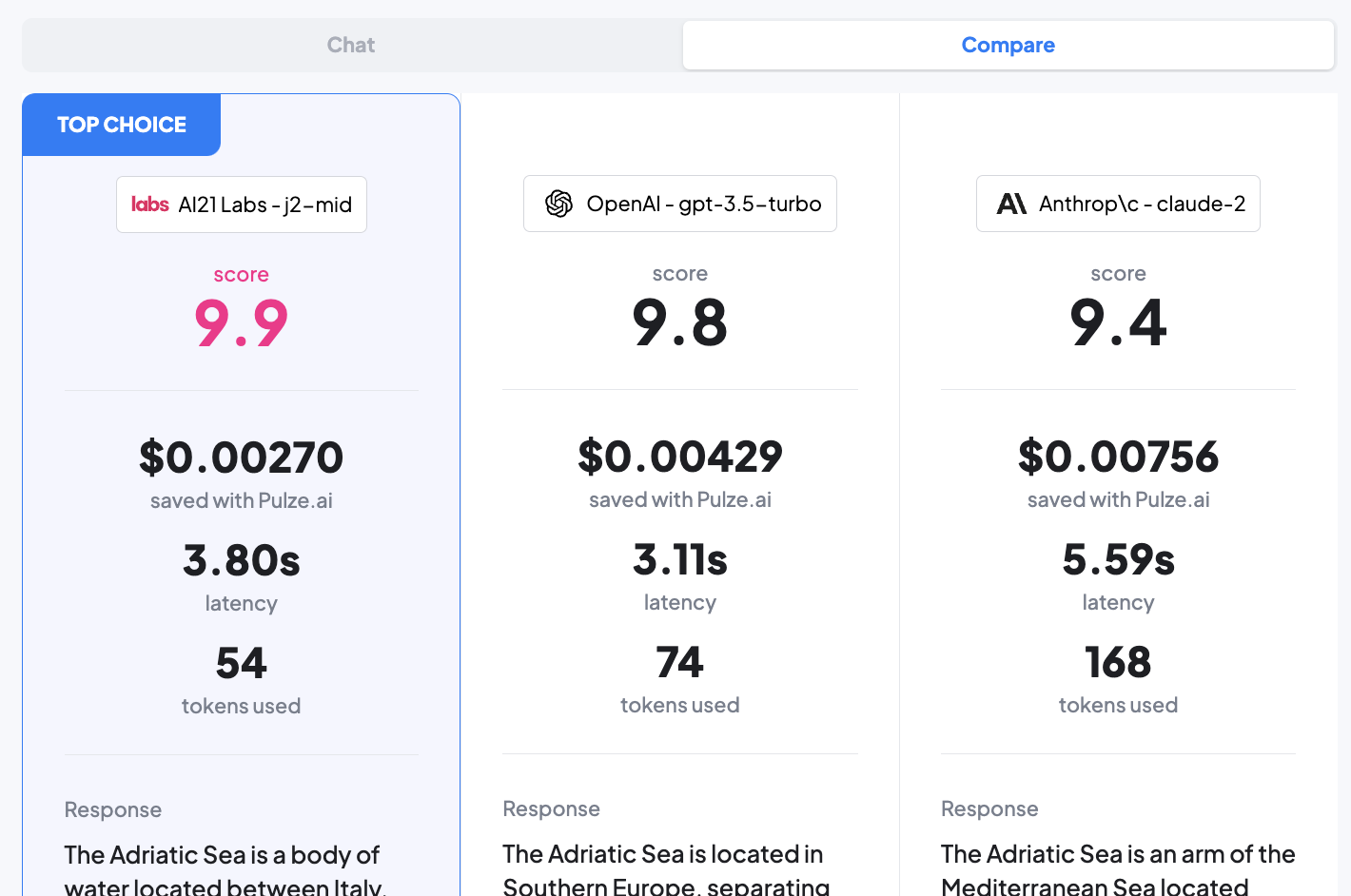 The playground is a tool built to showcase the capabilities of Pulze, especially its routing and model selection features. When accessing the playground and performing a request, three parallel calls will be done to the top 3 models chosen by our Decision Engine. You can use it to compare how different queries lead to different results.How to use it?