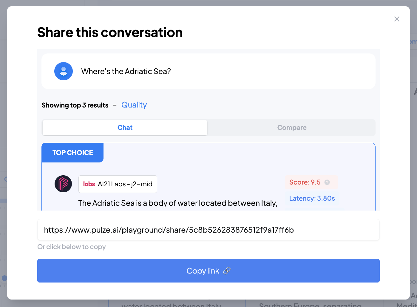 If you’d like to share a given conversation with your colleagues or friends, click the Share button to open the modal.
