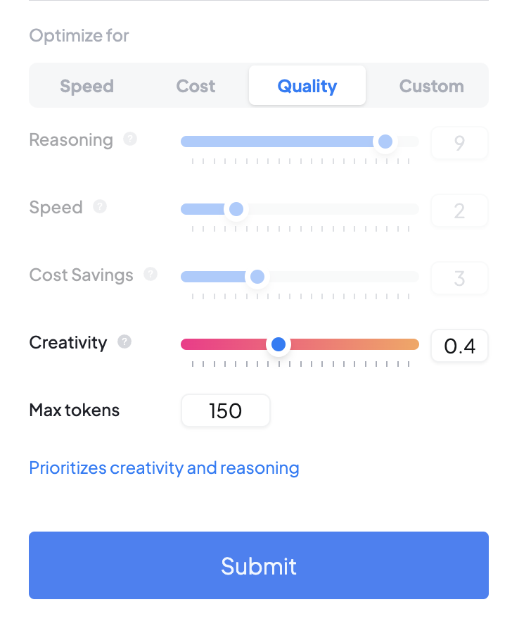 have a preference for models with a high quality.Select the maximum number of tokens (i.e. the limit on the length of the response) and the creativity too.
